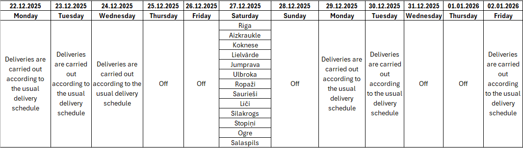 OUTSIDE RIGA, deliveries are made (on working days from 8:00 a.m. to 5:00 p.m.) according to the following schedule: