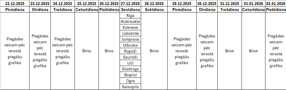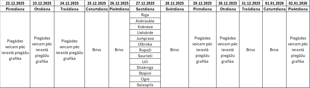 ĀRPUS RĪGAS piegādes tiek veiktas (darba dienās no plkst. 8:00 - 17:00) pēc sekojoša grafika: